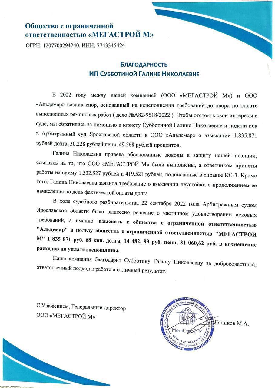 Юрист по коммерческой недвижимости и арбитражным спорам — Субботина Галина Николаевна